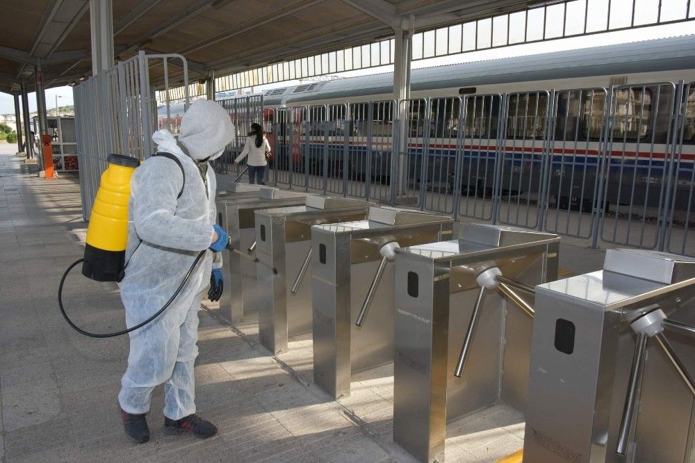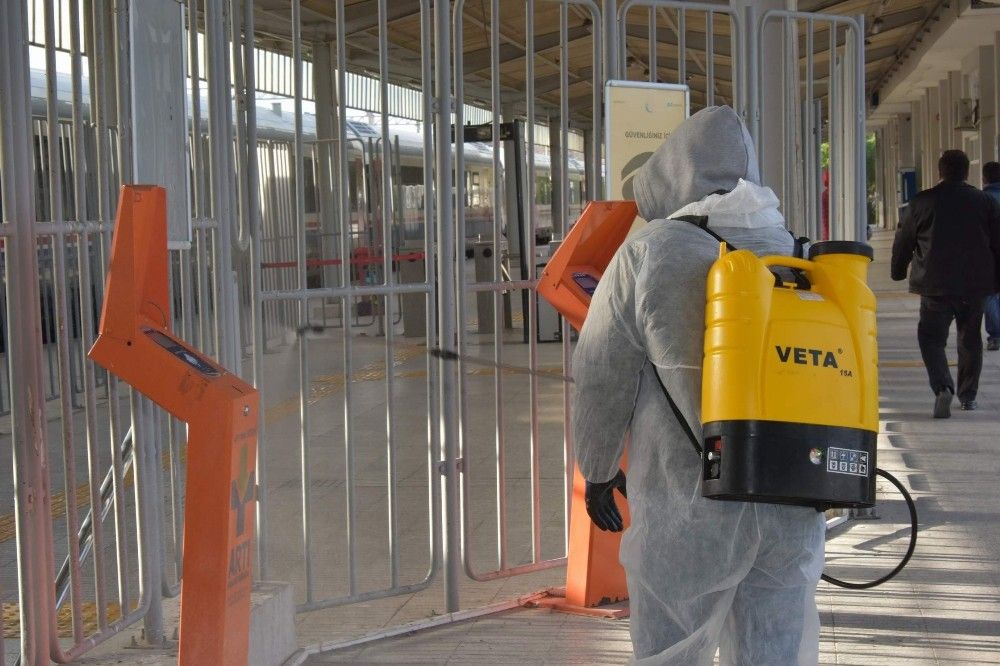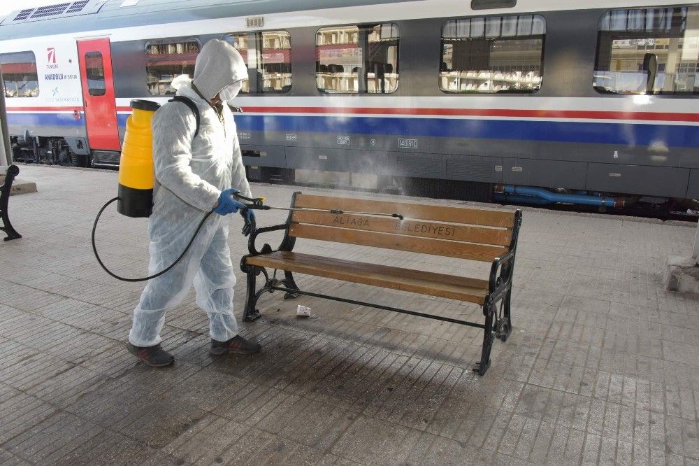 Korona virüsü salgını nedeniyle Türkiye'de vaka ve hasta sayılarında artış devam ediyor. Aliağa ilçesinde belediye ekipleri de, kent genelinde dezenfekte çalışmalarını sürdürüyor. Çalışmalar kapsamında ekipler tarafından, binlerce vatandaşın kullandığı İZBAN Aliağa İstasyonu, toplu ulaşım araçları ve duraklar dezenfekte edildi. Titiz bir çalışma yürüten ekipler, istasyonda vatandaşlar tarafından sıklıkla kullanılan turnikeler, para yükleme makineleri ve yine sürekli elle temas edilen noktalarda hassas bir çalışma yürüttü. Kent genelinde dezenfekte çalışmalarının devam edileceği bildirildi.