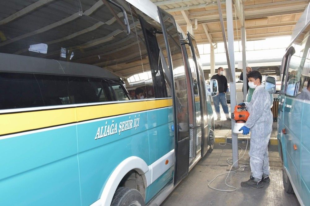 İzmir'in Aliağa ilçesinde, korona virüsü tedbirleri kapsamında toplu ulaşım araçları, duraklar, turnikeler yoğun bir şekilde dezenfekte ediliyor.