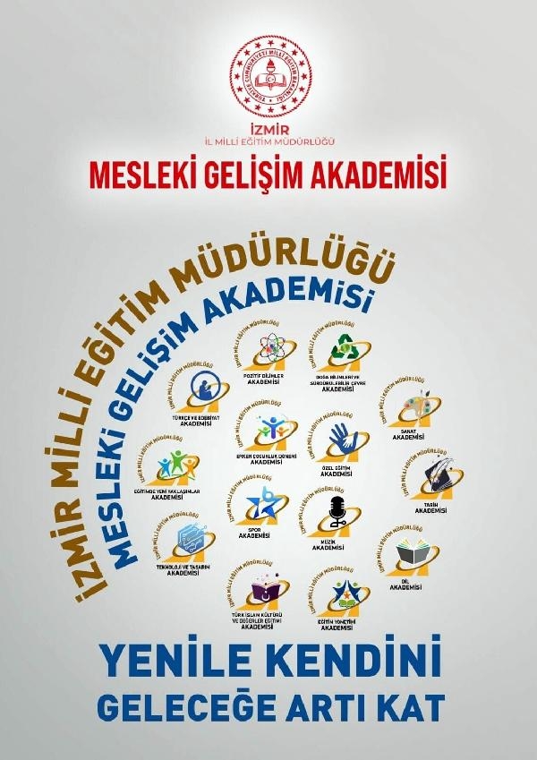 İl Milli Eğitim Müdürlüğü Mesleki Gelişim Akademisi, sosyal ve kültürel kimlikleriyle ufuk açan, alanında yaptığı çalışmalarla kendinden sonra gelenlere örnek teşkil eden isimleri, İzmir'de eğitimcilerle bir araya getiriyor. 'Yenile kendini geleceğe artı kat' sloganıyla yola çıkılan projeyle, eğitimcilerin mesleki gelişimlerinin desteklenmesi hedefleniyor. Alanında en çok ihtiyaç duyulan konu başlıklarının belirlendiği 'Mesleki Gelişim Akademisi'nde, teknolojinin tüm olanakları kullanılarak oluşturulan uzaktan eğitim buluşmalarının yanı sıra yüz yüze yapılan eğitim seminerleri ve atölye çalışmaları da yer alıyor. Eğitimcilerin gönüllülük esasına dayalı olarak başvurduğu akademide, 14 farklı konu başlığı bulunuyor. Bu kapsamda yıl boyunca; dil, tarih, Türkçe ve edebiyat, spor, sanat, müzik, pozitif bilimler, teknoloji ve tasarım, doğa bilimleri ve sürdürülebilir çevre, Türk-İslam kültürü ve değerler eğitimi, erken çocukluk dönemi, eğitimde yeni yaklaşımlar, özel eğitim ve eğitim yönetimi gibi her branşa hitap eden birbirinden farklı konularda eğitimler düzenlenecek.