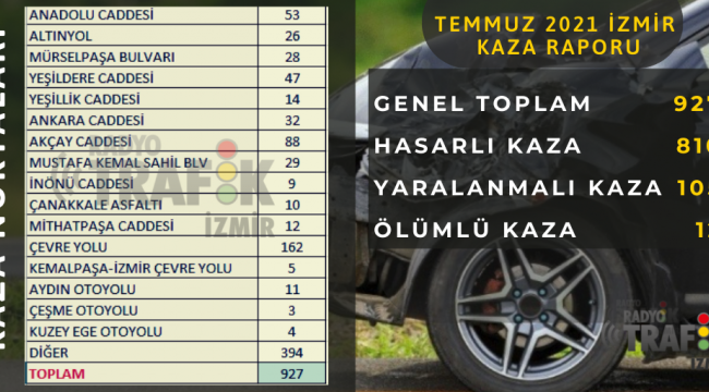Radyo Trafik İzmir, yaklaşık 3 yıldır İzmir trafiğinin nabzını tutuyor. Haber merkezimize ulaşan bilgilere göre, İzmir’de ana yollarda Temmuz ayı içerisinde 927 trafik kazası meydana geldi. Bu kazalardan 810’u hasarlı, 105’i yaralanmalıydı. 12 kaza ise ölümlü olarak kayıtlara geçti.