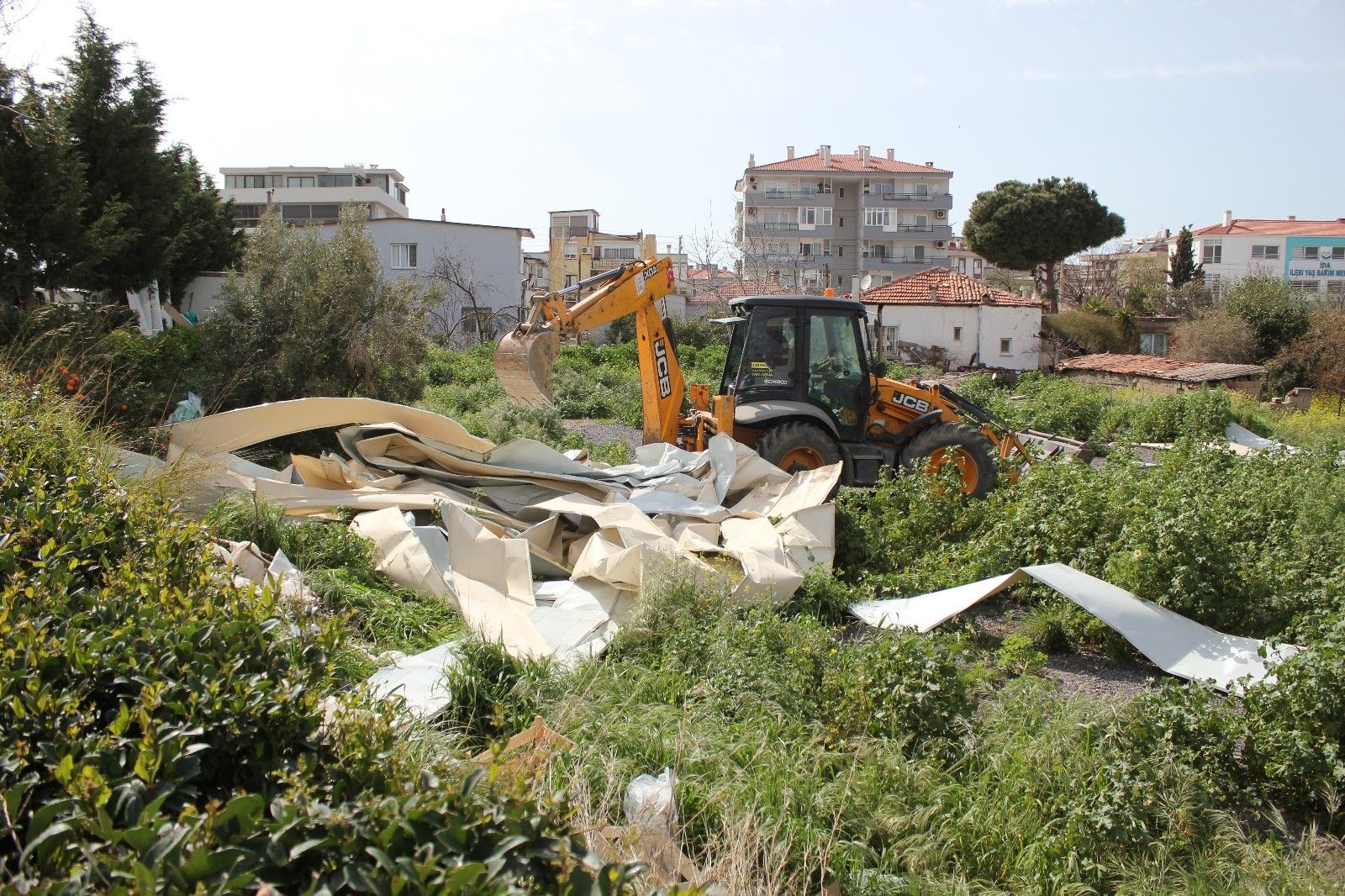 Fırtına nedeniyle üzerine çatı düşen pazaryerinde temizleme çalışmaları sürüyor.