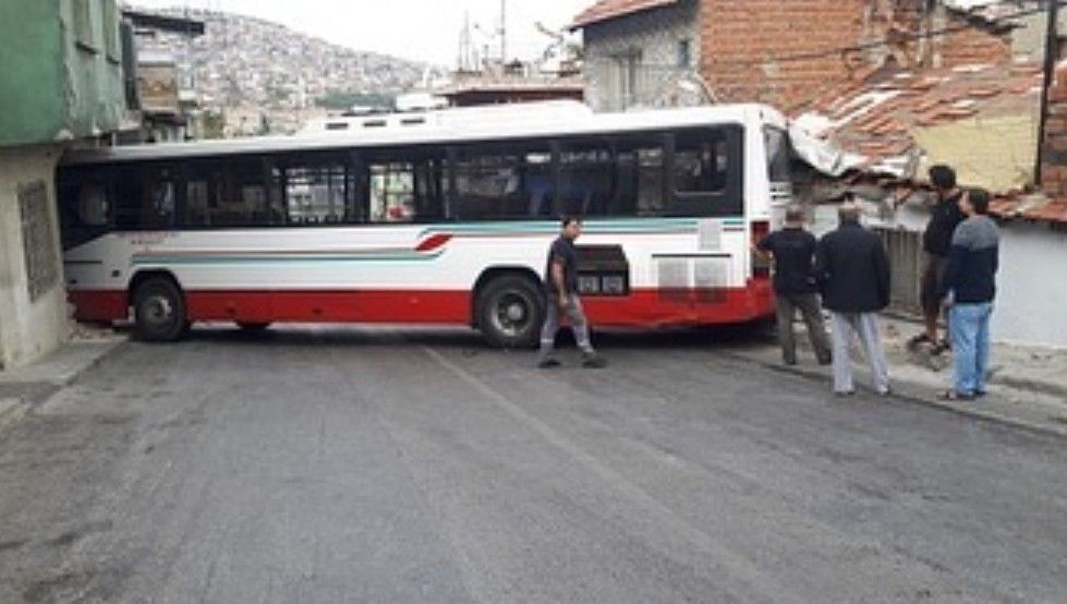 İzmir'in Konak ilçesinde, seyir halindeyken su birikintisinden kayan belediye otobüsü, karşılıklı 2 evin duvarını yıktı. Kazada otobüs içinde bulunan 6 kişi hafif yaralanırken, duvarı yıkılan bir evdeki kadın ise kazaya uykusunda yakalandı. Kaza anları güvenlik kameralarına yansıdı.