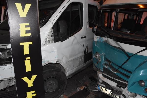 İZMİR'in Buca ilçesinde, ana yola çıkan kamyonet ile yolcu minibüsünün çarpıştığı kazada 12 kişi yaralandı. Minibüs sürücüsü hakkında 'basit yaralama' suçundan arama kararı olduğu, kamyonet sürücüsünün ise 0.98 promil alkollü olduğu belirlendi.