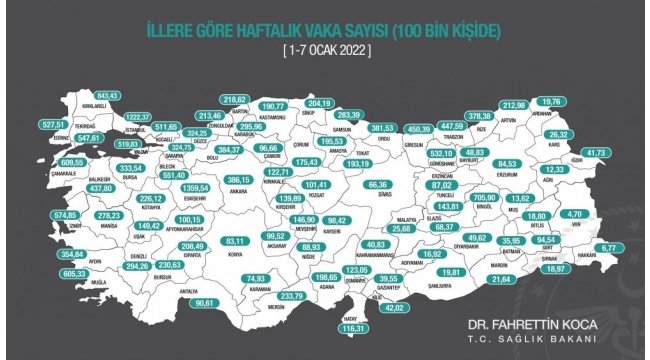 Koca, Twitter hesabındaki paylaşımında, "1-7 Ocak arasında, 100.000 kişi içinde bir haftalık toplam yeni Covid-19 vaka sayısı il bazında neydi? Bilgiler, haftalık İnsidans haritasında" ifadelerini kullandı.