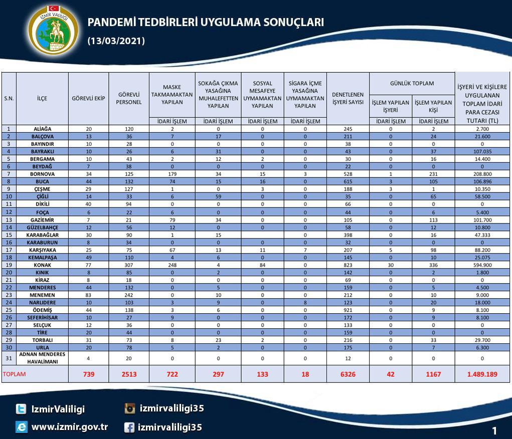 İzmir Valiliği, kontrollü normalleşme döneminde uygulanan dinamik denetim modeli kapsamında 13 Mart tarihinde, 30 ilçede ve Adnan Menderes Havalimanı'nda 739 ekip ve 2 bin 513 personelle uygulamalar gerçekleştirdi. Yapılan denetimlerde maske, sokağa çıkma kısıtlaması, sosyal mesafe ve önceden belirlenmiş yerlerde sigara içme yasağı kuralına uymayan vatandaşlar ve iş yerlerine cezai işlem uygulandı. Ekipler tarafından yapılan denetimlerde tedbir ve kurallara uymayan bin 167 kişiye idari işlem uygulandı.