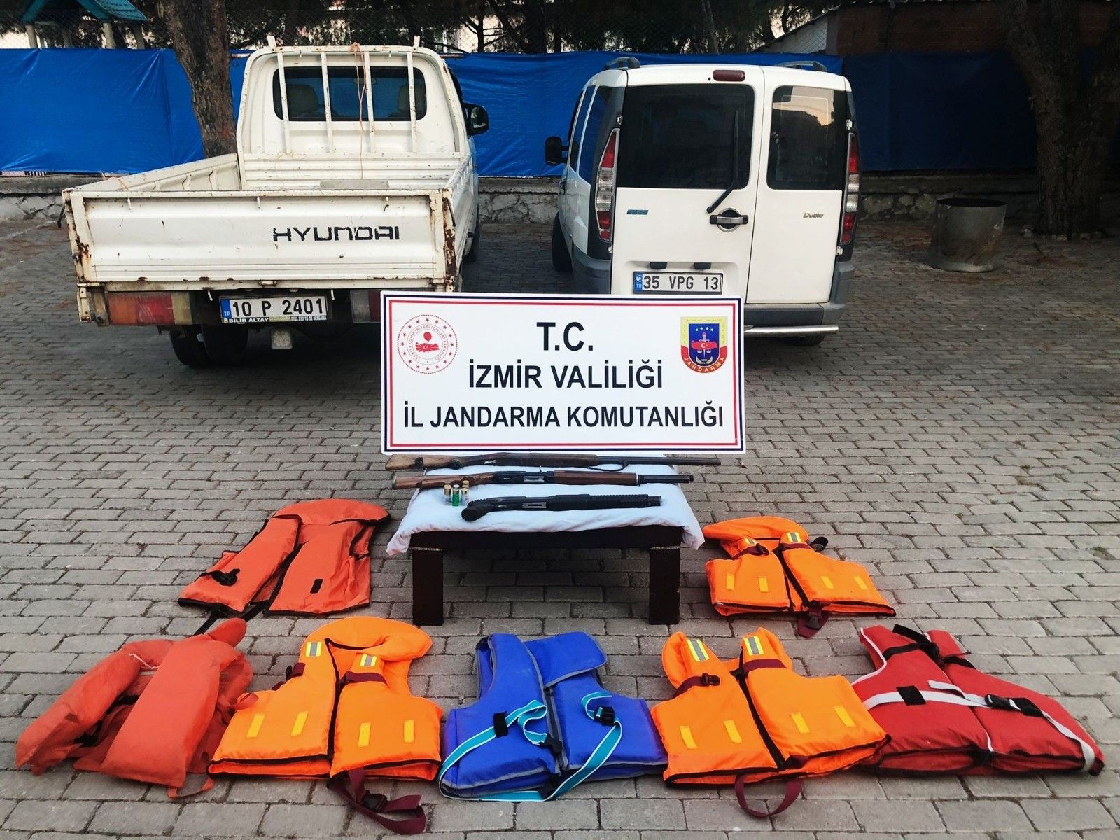 Öte yandan adreste yapılan aramalarda 3 adet ruhsatsız pompalı tüfek, tüfeklere ait 8 adet dolu fişek ve 7 adet can yeleği ele geçirildi. Gözaltına alınan şüpheliler işlemlerinin ardından adliyeye sevk edildi. Şüphelilerden C.T. ve F.I. tutuklanırken, Ö.A. adli kontrol şartıyla serbest bırakıldı.