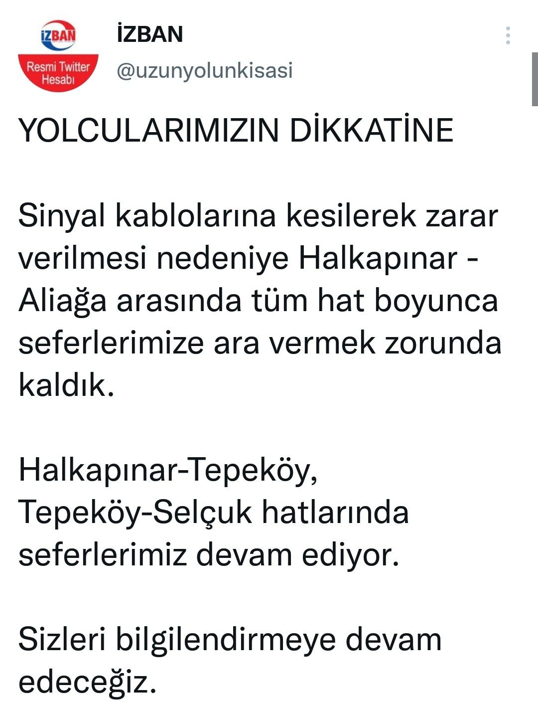İzmir Banliyö Taşımacılığı AŞ'nin (İZBAN) Twitter hesabından yapılan açıklamada, "Sinyal kablolarına kesilerek zarar verilmesi nedeniyle Halkapınar-Aliağa arasında tüm hat boyunca seferlerimize ara verdik. Halkapınar-Tepeköy, Tepeköy-Selçuk hatlarında seferlerimiz devam ediyor" ifadelerine yer verildi.