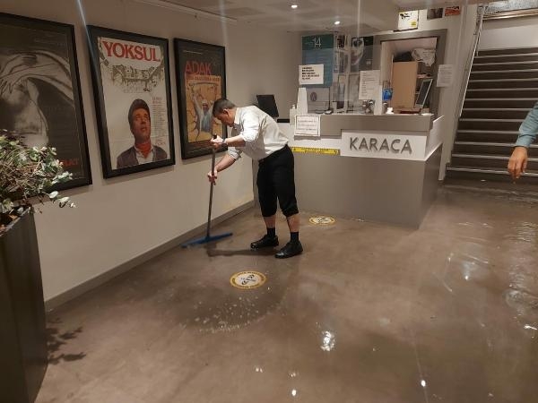 İZMİR'de, akşam saatlerinde etkisini artıran sağanak nedeniyle bazı iş yerlerini su bastı, kentin simgelerinden olan Karaca Sineması'nın giriş kısmı da suyla doldu. Sinema personeli, yağmur suyunu kendi çabasıyla tahliye etti.