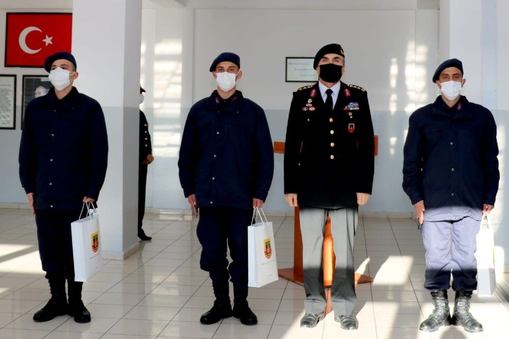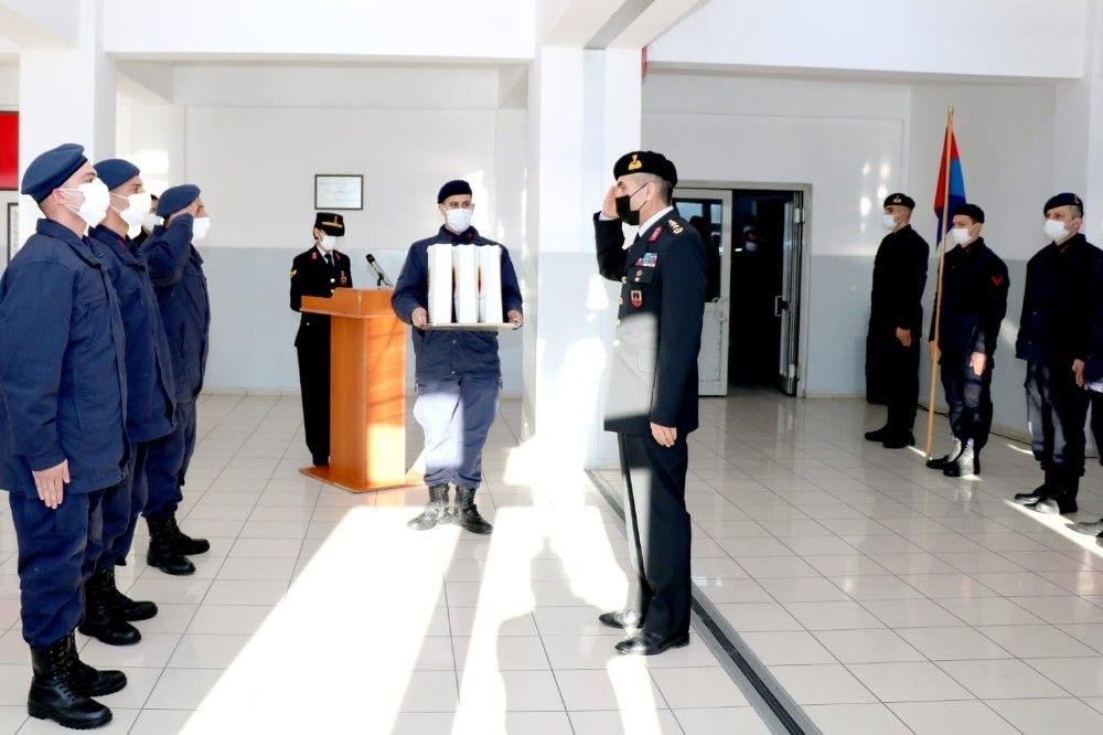 Konuşmanın ardından Türk bayrağına sarılı masaların üzerinde bulunan silahlara ellerini koyan askerler, hep bir ağızdan yemin etti. Daha sonra eğitim ile sporda başarılı olan askerlere ve İzmir İl Jandarma Komutanlığına ilk katılan askere ödüllerini Albay Dursun Değirmenci verdi.