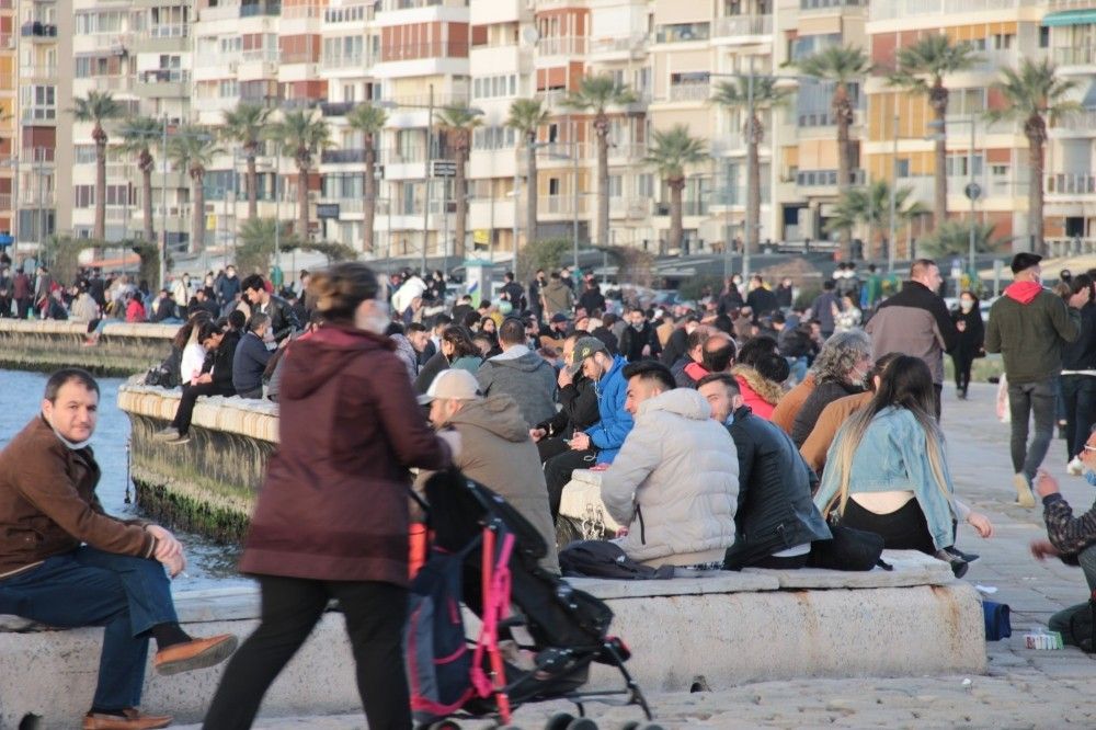 İzmir'de vatandaşlar, aylar sonra kısıtlamasız ilk cumartesi günü Alsancak'taki Kordon'a akın etti, her yer tıklım tıklım doldu.