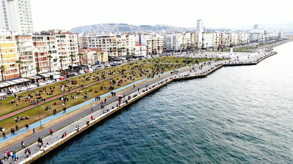 Vatandaşlar, özelikle Alsancak'ta bulunan Kordon'a akın ederek kalabalık görüntüler oluşturdu. Çimlere oturan İzmirliler, kısıtlamasız cumartesi gününün keyfini çıkardı, her yer tıklım tıklım doldu. Öte yandan oluşan yoğunluk, drone ile havadan görüntülendi. İzmir polisi de, denetime çıkarak vatandaşlara sosyal mesafeye uymaları konusunda uyardı.