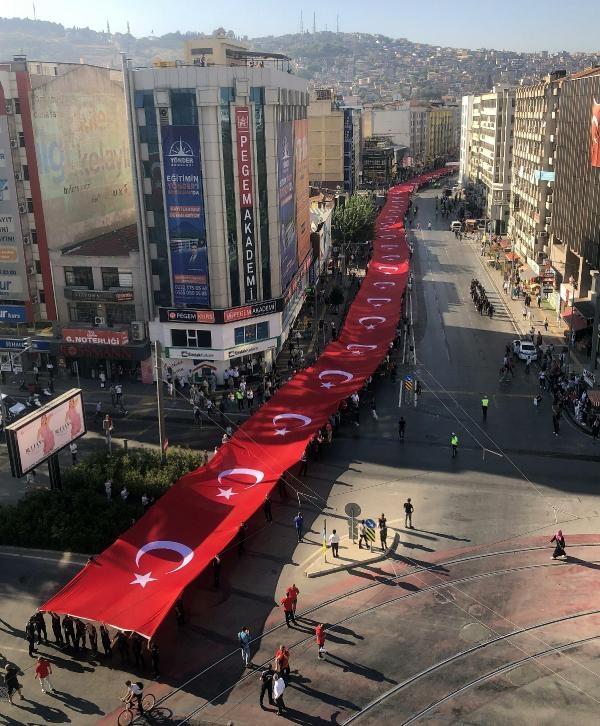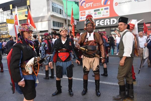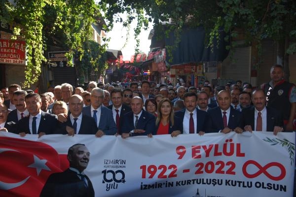 İzmir'in kurtuluşunun 100'üncü yıl dönümü kutlamaları Zafer Yürüyüşü'yle başladı. Basmane Karakolu'nda buluşan vatandaşlar, 350 metrelik dev Türk bayrağıyla Gaziler, Anafartalar ve İkiçeşmelik caddelerinden geçerek Cumhuriyet Meydanı'na yürüdü. Yürüyüşe İzmir Büyükşehir Belediye Başkanı Tunç Soyer, AK Parti Genel Başkan Yardımcısı Hamza Dağ, AK Parti İzmir İl Başkanı Kerem Ali Sürekli, CHP İzmir İl Başkanı Deniz Yücel, MHP İzmir İl Başkanı Veysel Şahin, AK Parti, CHP ve MHP İzmir milletvekilleri, belediye başkanları, STK'lar ve vatandaşlar katıldı. Kortejdekiler marşlarla yürürken, diğer vatandaşlar da o anları telefonlarıyla ölümsüzleştirdi. Balkon ve pencerelere çıkan vatandaşlar, alkışlarla korteje destek verdi.