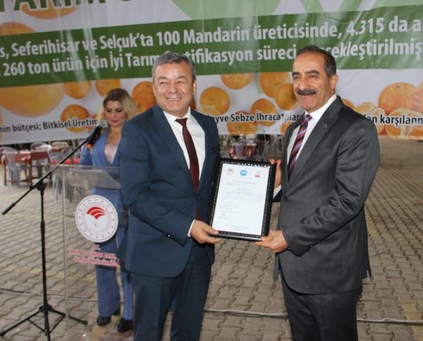 İZMİR Tarım ve Orman İl Müdürlüğü ve Ege Yaş Meyve Sebze İhracatçıları Birliği iş birliğinde yürütülen Seferihisar, Menderes ve Selçuk ilçelerinde 100 üreticiyi kapsayan 'Üretimden İhracata İyi Tarım Uygulamaları' projesinin kapanış toplantısı Seferihisar'da yapıldı. Menderes, Seferihisar ve Selçuk'ta 100 mandalina üreticisinde, 4 bin 315 dekar alanda 17 bin 260 ton ürün için İyi Tarım Sertifikasyon süreci gerçekleştirildi.