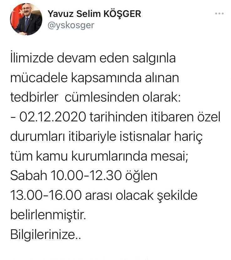 İzmir Valisi Yavuz Selim Köşger resmi Twitter hesabından yaptığı açıklamada, "02.12.2020 tarihinden itibaren özel durumları itibariyle istisnalar hariç tüm kamu kurumlarında mesai; sabah 10.00-12.30, öğle 13.00-16.00 arası olacak şekilde belirlenmiştir" yazdı.