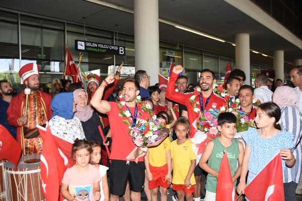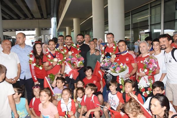 CEZAYİR'de düzenlenen 19'uncu Akdeniz Oyunları'nda ilk kez takım halinde olmak üzere toplam 11 madalya elde ederek tarihi bir başarıya imza adan Artistik Cimnastik Erkek Milli Takımı sporcuları İzmir'de bayraklar, çiçekler ve Mehter Takımı eşliğinde coşkuyla karşılandı.