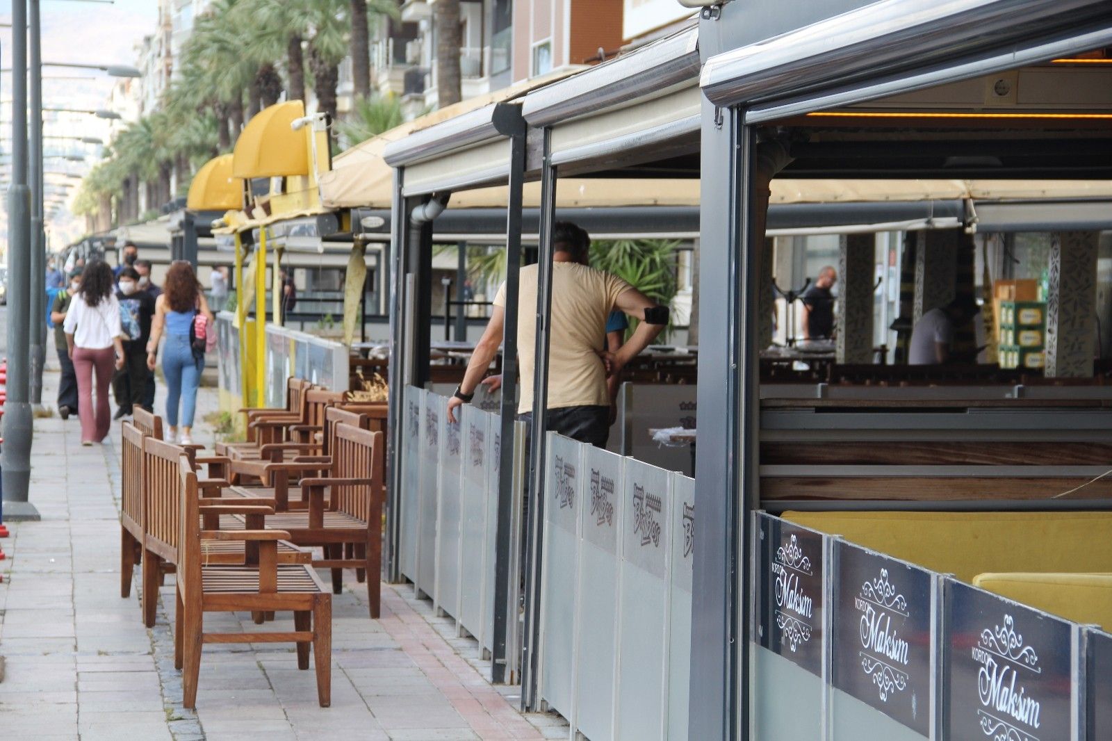 İzmir'in en işlek noktalarından biri olan Kordonboyu'nda da işletmeler normalleşme hazırlıklarına hızla devam ediyor. 200'ü aşkın restoran, kafe ve diğer yeme içme türü işletmenin bulunduğu Kordonboyu'nda esnaflar, masa ve sandalyelerini yeniden dükkanlarının önüne koyarak ve temizleyerek çalışmalarını sürdürüyor.