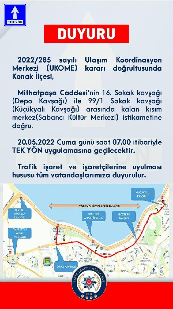 "2022/285 sayılı Ulaşım Koordinasyon Merkezi (UKOME) kararı doğrultusunda, Konak ilçesi Mithatpaşa Caddesinin 16 Sokak kavşağı (Depo kavşağı) ile 99/1 Sokak kavşağı (Küçükyalı Kavşağı) arasında kalan kısım merkez (Sabancı Kültür Merkezi) yönüne doğru, 20 Mayıs Cuma günü saat 07.00'den itibaren tek yön uygulamasına geçilecektir. Trafik işaret ve işaretçilerine uyulması hususu tüm vatandaşlarımıza duyurulur"