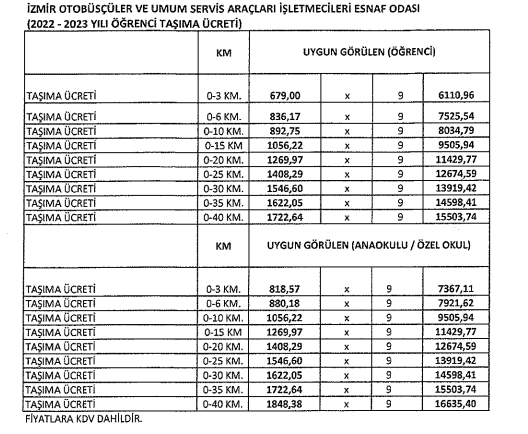 İzmir Otobüsçüler ve Umum Servis Araçları Esnaf Odası, artan akaryakıt, personel ve araç bakım onarım giderlerini gerekçe göstererek talep ettiği yüzde 25’lik öğrenci taşıma ücreti zammı yürürlüğe girdi. Buna göre, en yakın mesafe olan 0-3 kilometre arasında öğrenci taşıma ücreti 540 liradan 679 liraya yükseldi. 0-40 kilometre en uzak mesafenin ücreti de 1370 liradan1722 liraya çıktı.