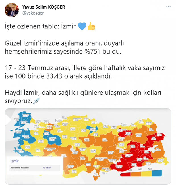 Sosyal medya hesabından Sağlık Bakanlığı'nın "En az bir doz aşı olmuş 18 yaş ve üstü nüfus" haritasını paylaşan İzmir Valisi Yavuz Selim Köşger, İzmir'in yüzde 75 aşılama oranına ulaşarak "mavi" kategoride yer aldığı haritaya ilişkin açıklamada bulundu. Köşger, "İşte özlenen tablo: İzmir... Güzel İzmir'imizde aşılama oranı, duyarlı hemşehrilerimiz sayesinde yüzde 75'i buldu. 17-23 Temmuz arası, illere göre haftalık vaka sayımız ise 100 binde 33,43 olarak açıklandı. Haydi İzmir, daha sağlıklı günlere ulaşmak için kolları sıvıyoruz." ifadelerini kullandı.Öte yandan, İzmir Sağlık Müdürlüğü yetkilileri de kentteki aşılama çalışmalarının tüm hızıyla sürdüğünün bilgisini verdi.