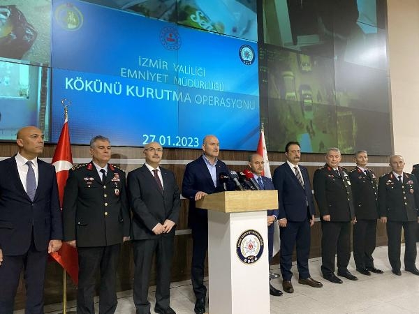 İçişleri Bakanı Soylu, İzmir Emniyet Müdürlüğü'nce 'Kökünü Kurutma Operasyonu' başlatıldığını duyurdu. İl Emniyet Müdürlüğü Kent Güvenlik Yönetim Sistemi binasındaki toplantıda Bakan Soylu'nun yanı sıra Emniyet Genel Müdürü Mehmet Aktaş, Jandarma Genel Komutan Yardımcısı Orgeneral Ali Çardakçı, Vali Yavuz Selim Köşger, Narkotik Suçlarla Mücadele Daire Başkanı İbrahim Seydioğulları da yer aldı. Operasyon kapsamında 225 hedefin 202'sinin gözaltına alındığını belirten Soylu, "Bu mübarek gecenin sabahında 'Kökünü Kurtarma Operasyonu'nun 36'ncısını İzmir'de gerçekleştirdik. İzmir Cumhuriyet Başsavcılığı koordinasyonunda İzmir İl Emniyet Müdürlüğü'müz ve İzmir İl Jandarma Komutanlığı'mızla toplam 1472 personelin katılımıyla, 24 dedektör köpeği, hava araçlarıyla birlikte sabah saat 06.15'te başlayan operasyonda 225 hedefimiz, 136 da girilecek yer söz konusuydu. 202 hedefe ulaşıldı ve gözaltına alındılar. Bu nedenle İzmir İl Emniyet Müdürlüğü'müz ve İzmir İl Jandarma Komutanlığı'mızı tebrik ediyorum. Sabah itibarıyla Vali'miz, Emniyet Genel Müdürü'müz, Jandarma Genel Komutan Vekili'miz, Narkotik Daire Başkanı'mız, İzmir İl Emniyet Müdürü ve İzmir İl Jandarma Komutanı'mız ile birlikte operasyonun seyrini takip ettik. Allah'a çok çok şükür, kazasız belasız tamamladık. Bu Türkiye'deki 36'ncı 'Kökünü Kurutma Operasyonu'" dedi.
