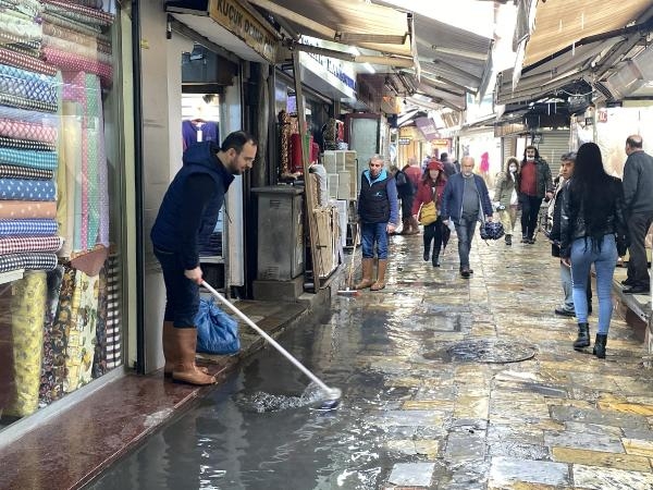 İZMİR'de etkili olan sağanak, hayatı olumsuz etkilerken, tarihi Kemeraltı Çarşısı'ndaki iş hanını su bastı. Esnaf, biriken suları tahliye etmeye çalıştı.