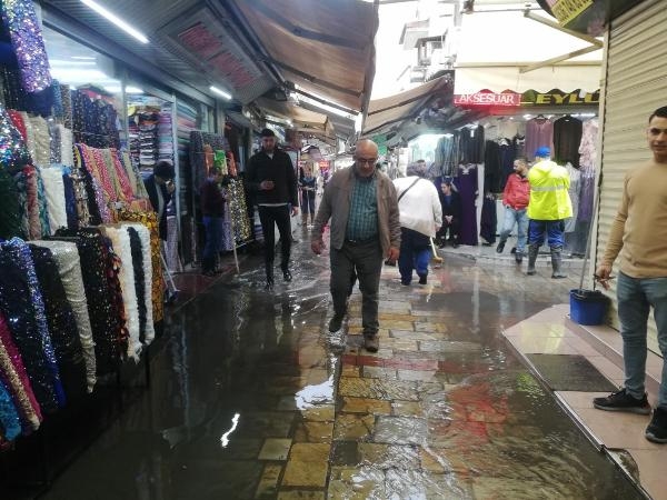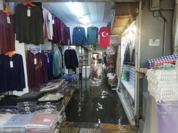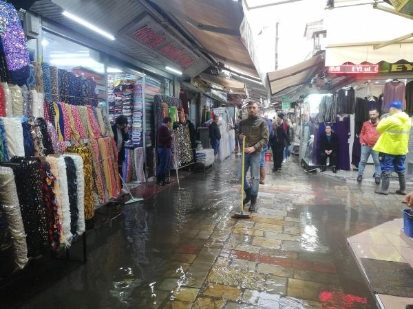 İZMİR'de etkili olan sağanakla birlikte tarihi Kemeraltı Çarşısı'nda su baskınları yaşandı. Esnaftan bazıları, ellerinde fırçalarla suların dükkanlarına girmesini engellemeye çalıştı.