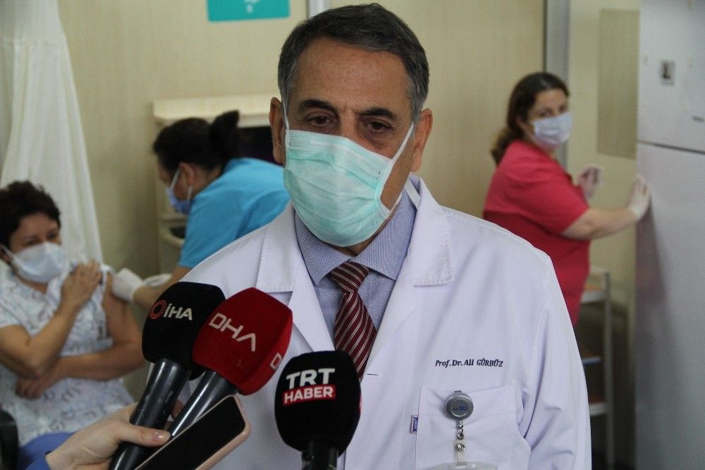 Aşılama hakkında konuşan İzmir Katip Çelebi Üniversitesi Atatürk Eğitim ve Araştırma Hastanesi Başhekimi Prof. Dr. Ali Gürbüz, "Burası Sağlık Bakanlığımızın en çok salgınla ilgili görev verdiği hastanelerimizden bir tanesi. Aşılama bugün bilim kurulumuzun ve bakanımızın direktifleri doğrultusunda başlamış bulunuyor. MHRS'den randevusunu alan bütün çalışanlarımız polikliniklerimize gelmeye başladılar ve kısmi bir yoğunluk var. Zannediyorum ki 3-4 gün içerisinde aşılama sürecini tamamlamış olacağız. Daha sonrada yine bilim kurulu ve bakanlığımızın direktifleriyle randevularını alan vatandaşlarımıza aşılama programına devam edeceğiz. Biliyorsunuz sağlık çalışanları korona virüsle direkt muhatap olan kişiler. Bizim hastanemizde de korona virüse yakalanan sağlık çalışanlarımız oldu. Bu aşılamanın sağlık çalışanlarından başlamasından memnuniyet duyuyoruz.