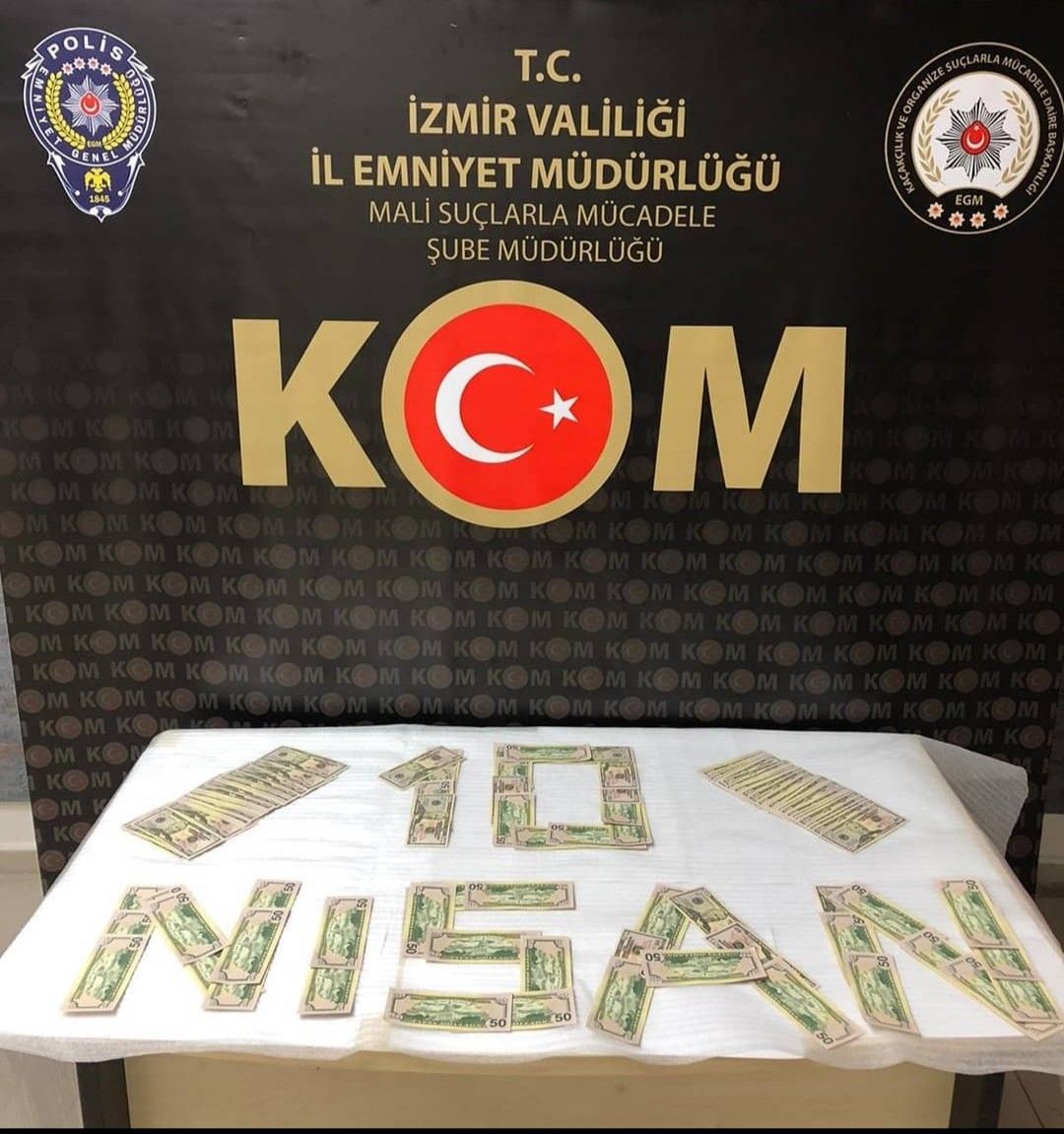 Öte yandan sahte 10 bin ABD dolarını başarılı bir takibin ardından ele geçiren İzmir Mali Suçlarla Mücadele Şube Müdürlüğü ekipleri, ele geçirilen sahte paralarla masada 10 Nisan yazarak Polis Gününe atıfta bulundu.