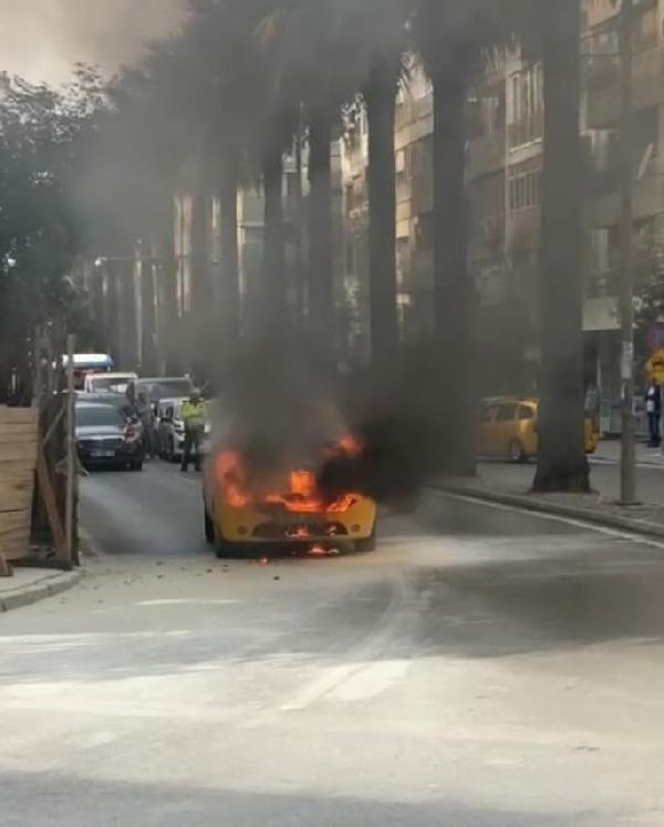 Talatpaşa Bulvarı'nda saat 11.00 sıralarında, seyir halindeki içerisinde yolcu bulunmayan 35 T 6896 plakalı taksinin motor kısmından, alevler yükselmeye başladı. Kısa sürede büyüyen alevler, aracın ön bölümünü sardı. Şoför, taksiyi yolun ortasında bırakıp indi. Çevredekiler durumu itfaiye ve polis ekiplerine bildirdi. İhbar üzerine gelen itfaiye ekipleri, su sıkarak alevleri söndürdü. Bu sırada güvenlik önlemi alan polis ekipleri, Talatpaşa Bulvarı'nı araç trafiğine kapattı. Alevlerin söndürülmesinin ardından yol yeniden trafiğe açıldı. Taksi kullanılamaz hale gelirken, yangının çıkış nedeni araştırılıyor. (DHA)