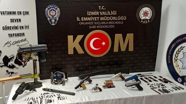 İZMİR'in 2 ayrı ilçesinde atölyeye çevirdikleri iş yerlerinde yasa dışı silah ticareti yaptığı tespit edilen 2 şüpheli gözaltına alındı; 23 tabanca, 3 tüfek, 1 el yapımı boru tipi tüfek, 3 kurusıkı tabanca, 31 şarjör ve 155 fişek ele geçirildi.