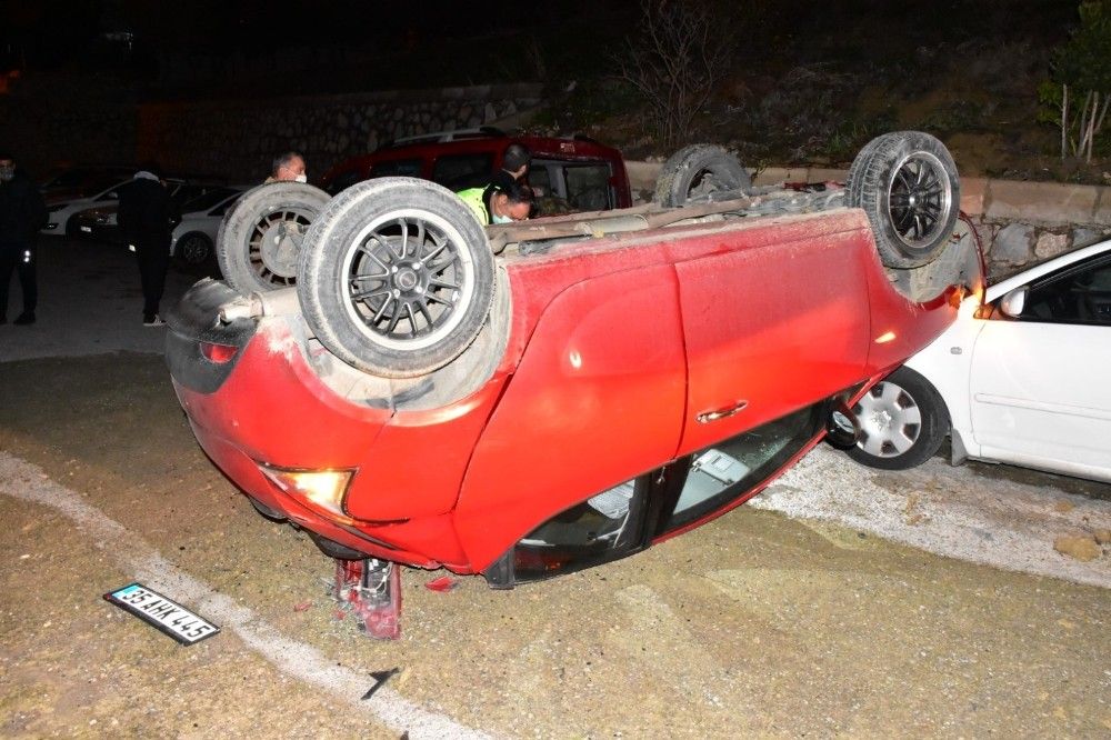 Edinilen bilgiye göre kaza, 00.30 sıralarında Erzene Mahallesi 113/28 sokakta meydana geldi. İddiaya göre, Orçun K. yönetimindeki 35 AHK 445 plakalı Lancia model otomobil, sürücüsünün direksiyon hakimiyetini kaybetmesi sonucu şarampole yuvarlanarak takla attı. Kazayı gören çevre sakinleri durumu8 polis ve sağlık ekiplerine ihbar ederken, ihbar üzerine kaza yerine gelen polis ekipleri çevre güvenliğini sağladı. Otomobilde bulunan Orçun K. ve Fulya K. kendi imkanları ile otomobilden çıkarken, 2 kişi kazayı hafif sıyrıklarla atlattı. Öte yandan kazada 35 AH 5715 ve 35 HUY 03 plakalı araçların hasar gördüğü öğrenildi.
