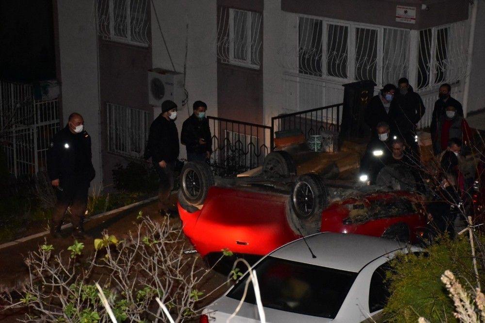 İzmir'in Bornova ilçesinde sürücüsünün direksiyon hakimiyetini kaybettiği araç şarampole uçtu. Takla atan araç sokaktaki arabaların üzerine uçarken araç içerisinde bulunan 2 kişi hafif sıyrıklarla kazayı atlattı.
