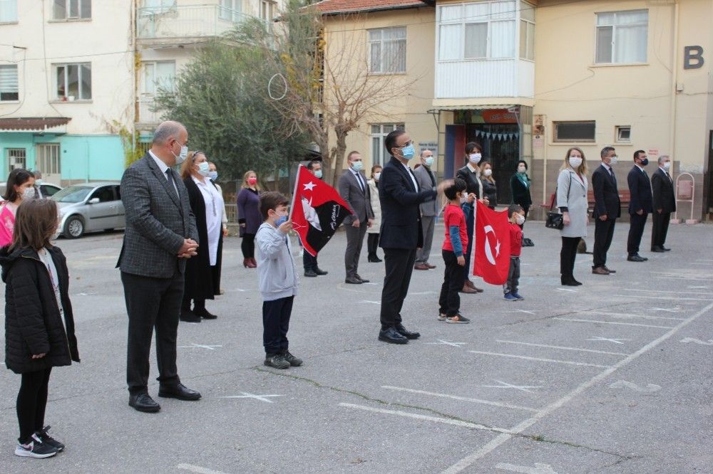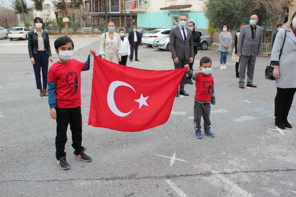 İzmir Ömer Seyfettin İlkokulunda gerçekleşen etkinlikte İstiklal Marşı ve saygı duruşu ardından okul öğrencisi Aras Gümüş ve kardeşinin bayrak açarak etkinliğe katılması tebessüm dolu anlar yaşattı.