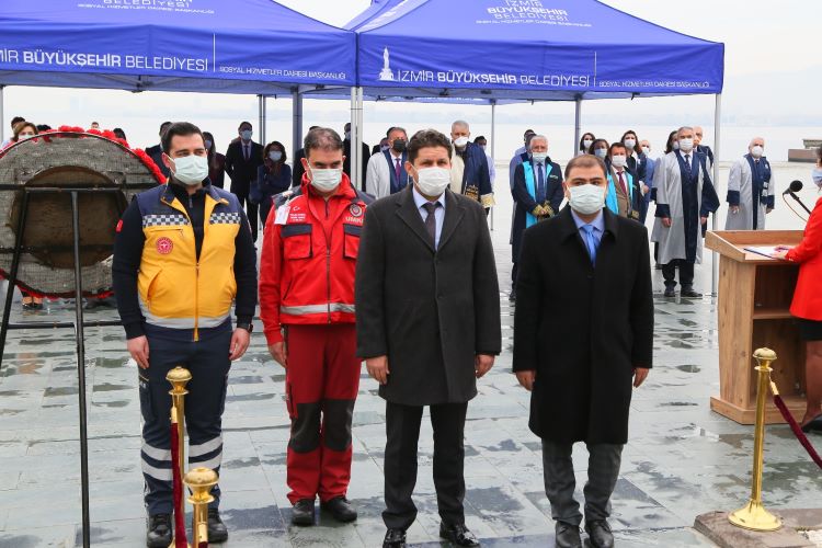 Çelenk koyma törenine İzmir Vali Yardımcısı Fatih Kızıltoprak, İzmir İl Sağlık Müdürü Op. Dr. M. Burak Öztop, İlimiz Üniversiteleri tıp fakültesi dekan ve dekan yardımcılarının yanında akademisyenler, Tabip Odası temsilcileri, sağlık çalışanları ve tıp fakültesi öğrencileri katıldı. Tören, Saygı duruşu ve İstiklal Marşı’nın ardından kurumların Atatürk Anıtı’na çelenk koymaları ile devam etti.