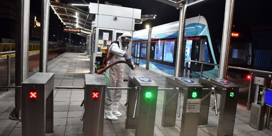 İzmir'de toplu taşıma araçları ile istasyonlarda virüslerle mücadele için özel temizlik çalışması başlatıldı.