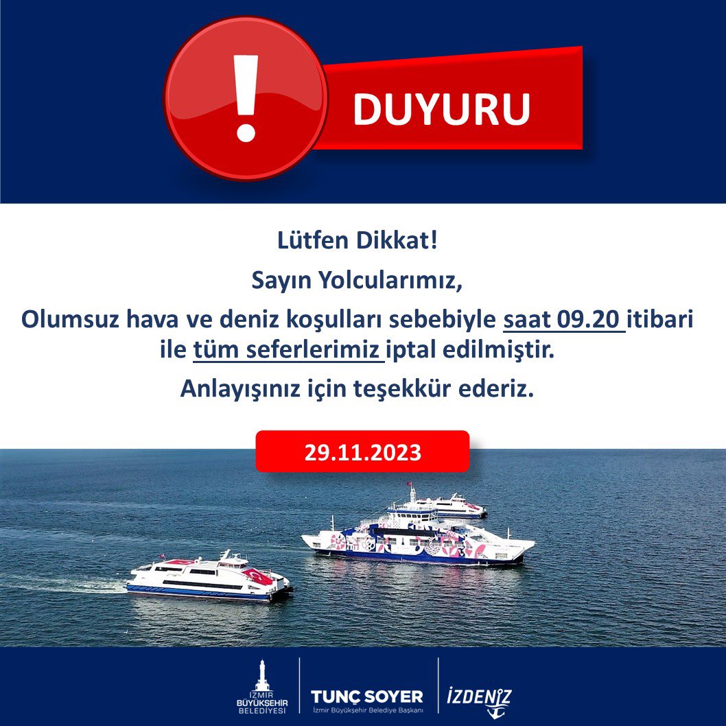 “Sayın yolcularımız, olumsuz hava ve deniz koşulları sebebiyle ile tüm vapur seferleri saat 09.20 itibariyle iptal edilmiştir. Anlayışınız için teşekkür ederiz.”