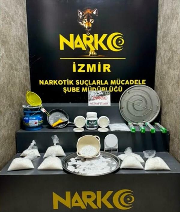 İzmir İl Emniyet Müdürlüğü Narkotik Suçlarla Mücadele Şube Müdürlüğü ekiplerince yürütülen saha ve analiz çalışmalarında Menderes ilçesinde bir adresin uyuşturucu imalathanesi olarak kullanıldığı tespit edildi. Adrese düzenlenen operasyonda 9 kilo 320 gram metamfetamin, 1 hassas terazi, 2 tabanca, 15 tabanca mermisi, uyuşturucu imalatında kullanılan madde ve malzemeler ele geçirildi. Operasyon kapsamında S.T. ve M.G. gözaltına alındı. Emniyetteki işlemlerin ardından adliyeye sevk edilen S.T. ve M.G, çıkarıldıkları mahkemece tutuklanarak cezaevine gönderildi. (DHA)
