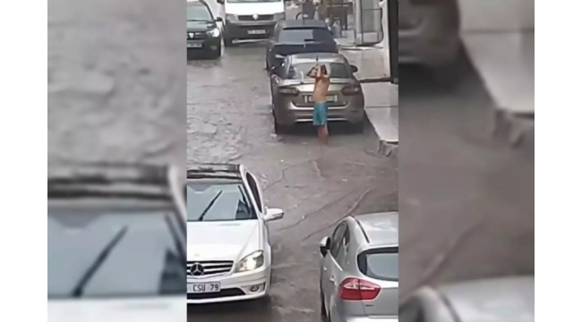 Bölgede etkisini sürdüren sağanak yağmur su taşkınlarına neden oldu. Öte yandan sel suları altında kalan bir vatandaşın şampuan dökerek yıkandığı görüldü. O anlar kaydedildi.