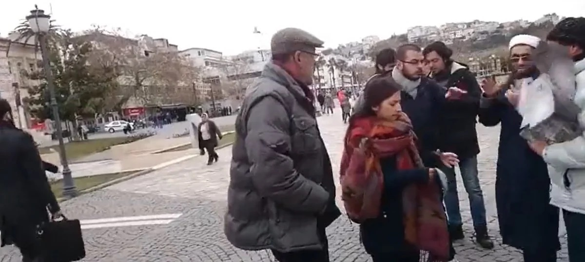 Kent meydanında yılbaşı kutlamalarının haram olduğunu savunarak bildiri dağıtan bir grup, tepki gördü. Genç kadın, kağıtları yırtarken, "Burası İzmir, defolup gideceksiniz" dedi.