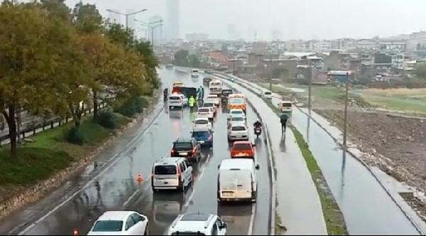 Kaza, saat 10.00 sıralarında, Yeşildere Caddesi üzerinde meydana geldi. İddiaya göre, Gaziemir - Yeni Garaj seferi yapan 35 M 8926 plakalı yolcu minibüsü, yağmur nedeniyle kayganlaşan yolda sürücüsünün direksiyon hakimiyetini kaybetmesi sonucu devrildi. İçerisinde yolcunun bulunmadığı minibüs yan yatarken, kazayı gören diğer sürücülerin ihbarı üzerine bölgeye AKS, polis ve sağlık ekipleri sevk edildi. Minibüste sıkışan şoför AKS ekipleri tarafından çıkartılırken, sağlık ekipleri yaralıyı ambulansla Tepecik Eğitim ve Araştırma Hastanesi'ne kaldırdı. Burada tedaviye alınan şoförün sağlık durumunun iyi olduğu öğrenildi. Minibüsün çekiciyle yoldan kaldırılmasının ardından trafik normale dönerken, kazayla ilgili soruşturma başlatıldı. (DHA)