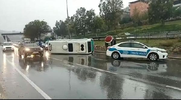 İZMİR'in Konak ilçesinde, yağmurlu havada kontrolden çıkıp devrilen, içinde yolcu bulunmayan minibüsün şoförü yaralandı.