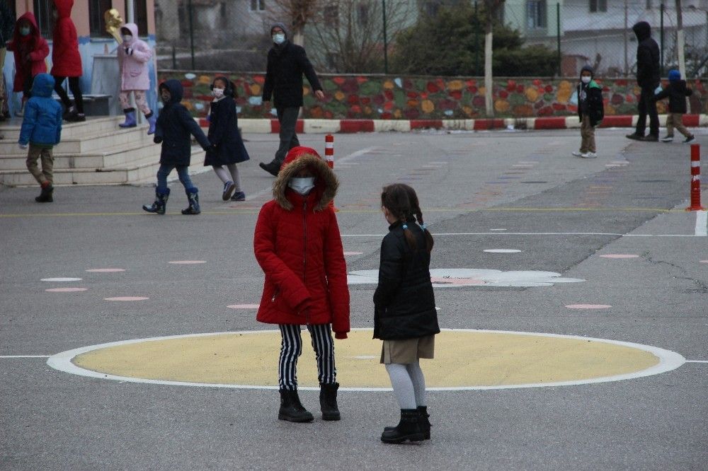 Maskelerini takarak okullara giren çocuklar, teneffüslerde de öğretmenlerin uyarısıyla sosyal mesafeye uyarak oyun oynadı.