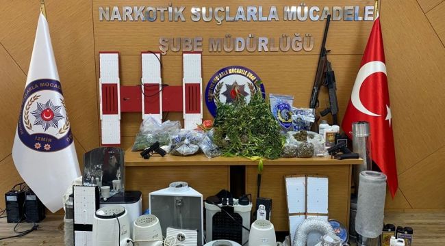 İzmir İl Emniyet Müdürlüğü Narkotik Suçlarla Mücadele Şube Müdürlüğü ekipleri, kent genelinde uyuşturucu madde imal eden ve ticaretini yapan şahısların yakalanması için harekete geçti. Ekipler, toplamda 23 farklı adreste eş zamanlı operasyonların düğmesine bastı. Baskınlarda; 1 kilo 927 gram esrar maddesi, 44 kök hint keneviri, 33 adet uyuşturucu hap, 2 adet ruhsatsız tabanca, 1 adet ak-47 kaleşnikof tüfek, 1 adet av tüfeği, 6 adet hassas terazi ve çok sayıda uyuşturucu madde yetiştirmek için kullanılan düzenek ele geçirildi.