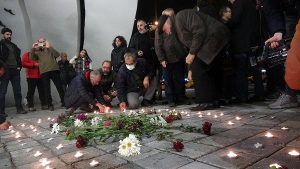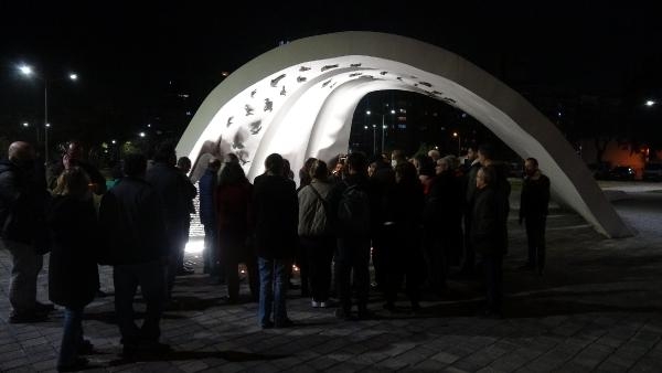 İZMİR'in Bayraklı ilçesindeki Deprem Anıtı'nda toplanan vatandaşlar, 6 Şubat'ta Kahramanmaraş merkezli iki depremde hayatını kaybeden vatandaşlar için anma töreni düazenledi.