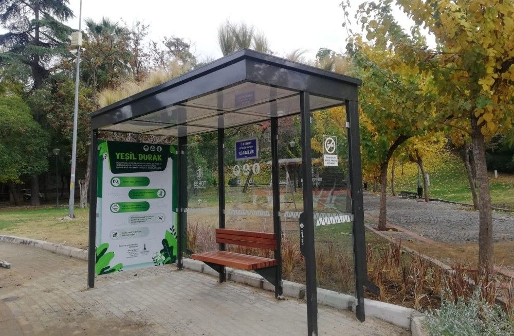 Doğal dokudan yoksun yerler için düşünülen Yeşil Durak Projesi, ilk etapta Halkapınar Aktarma Merkezi için planlandı. Konak Bahribaba Parkı'na konulan ilk örnek beğenilirse Halkapınar'daki tüm otobüs duraklarına uygulanacak. Öte yandan durakların çatısına güneş panelleri de eklenerek, kendi enerjisini üretebilir olması planlanıyor.