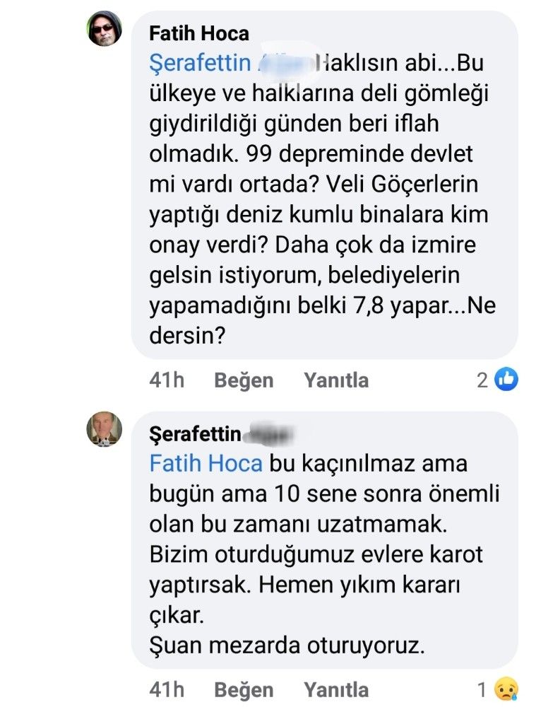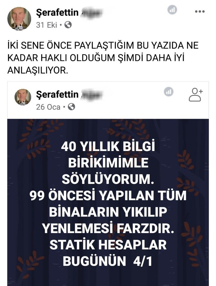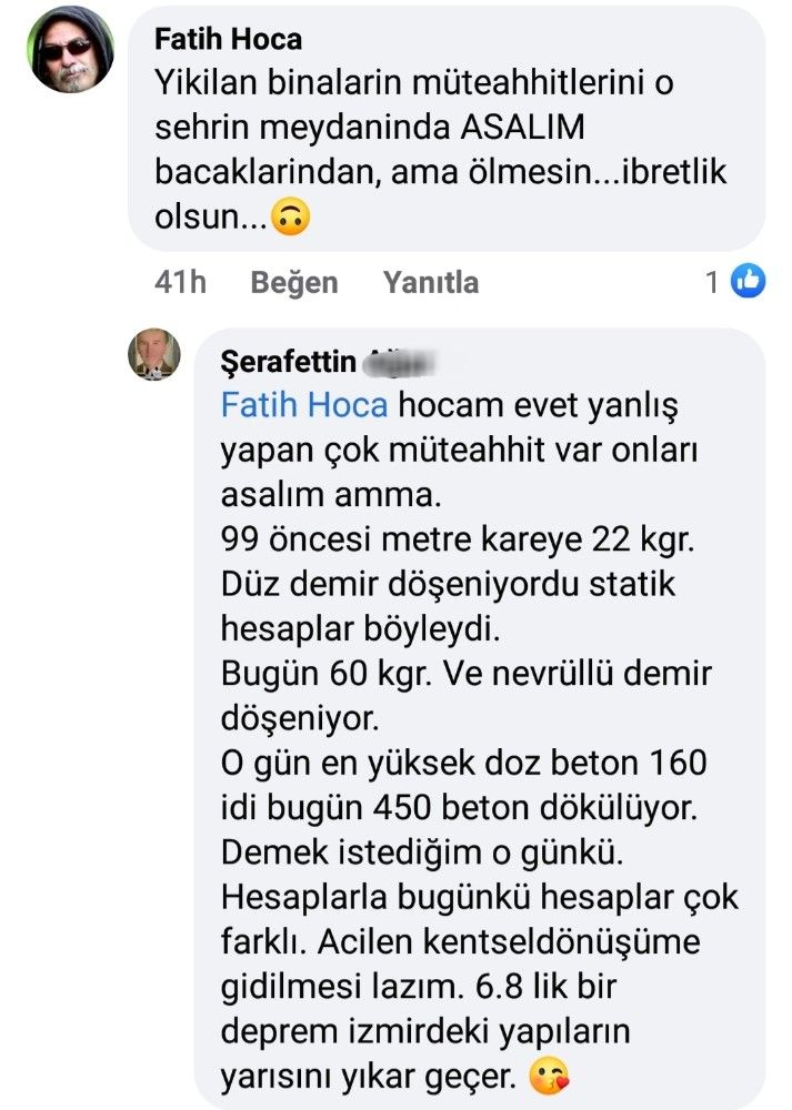 Öte yandan Şerafettin A. isimli tutuklu müteahhitin Elazığ depreminden sonra paylaştığı gönderinin altına yapılan yorumlar ve verdiği cevaplar da dikkat çekti. Bir vatandaşın, "Yıkılan binaların müteahhitlerini şehrin meydanına asalım" yorumuna Şerafettin A.'nın, " Hocam evet yanlış yapan çok müteahhit var. Onları asalım ama 1999 öncesi metrekareye 22 kilo düz demir döşeniyordu, statik hesaplar böyleydi. Bugün 60 kilo nevrüllü demir döşeniyor. O günkü hesaplarla bugünkü hesaplar çok farklı. Acilen kentsel dönüşüme gidilmesi gerekiyor. 6.8'lik bir deprem, İzmir'deki yapıların yarısını yıkar geçer. Oturduğumuz evlere kator yaptırsak hemen yıkım kararı çıkar. Şu an mezarda oturuyoruz" şeklinde verdiği cevap verdiği ortaya çıktı.