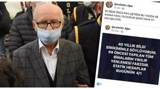 30 Ekim tarihinde merkez üssü Seferihisar açıkları olan ve 115 kişinin hayatını kaybettiği depremin ardından yıkılan binaların müteahhitleri ve fenni mesullerinin de aralarında bulunduğu 7 şahıs tutuklanmıştı. Depremde yerle bir olan ve 8 kişinin hayatını kaybettiği Yağcıoğlu Apartmanı'nın müteahhiti olan Şerafettin A. da tutuklular arasında yer aldı. Şerafettin A.'nın, 24 Ocak'ta meydana gelen Elazığ'ın Sivrice ilçesi merkezli deprem ile ilgili paylaştığı gönderiler ortaya çıktı. Şerafettin A.'nın 26 Ocak'taki paylaşımında, "40 yıllık birikimimle söylüyorum. 1999 öncesinde yapılan tüm binaların yıkılıp yenilenmesi farzdır. Statik hesaplar bugünün 4'te1'i" yazan bir paylaşım yaptığı görüldü. Tutuklu müteahhitin, bu paylaşımı 31 Ekim'de yeniden paylaşarak "Ne kadar haklı olduğum şimdi daha iyi anlaşılıyor" notuyla bir kez daha paylaştığı görüldü.