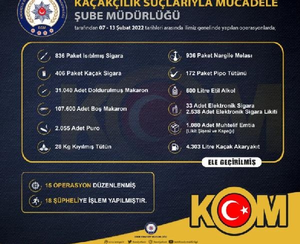 Öte yandan, 7-13 Şubat tarihleri arasında Kaçakçılık Suçlarla Mücadele Şube Müdürlüğü'nün gerçekleştirdiği 15 operasyonda; 836 paket ısıtılmış sigara, 406 paket kaçak sigara, 31 bin 40 doldurulmuş makaron, 107 bin 600 boş makaron, 2 bin 55 puro, 28 kilo kıyılmış tütün, 936 paket nargile melası, 172 paket pipo tütünü, 600 litre etil alkol, 4 bin 300 litre kaçak akaryakıt, 33 elektronik sigara ve 2 bin 538 elektronik sigara likiti ele geçirildiği öğrenildi. Ayrıca, 15 operasyonda 18 şüpheliye işlem yapıldığı bildirildi. Trafik Denetleme ve Bölge Trafik Deneme Şube Müdürlükleri, kentte trafik kurallarının ihlal edilmesini önlemek için 7-13 Şubat tarihlerinde yaptığı uygulamalarda; çeşitli trafik ihlallerinden 20 bin 723 trafik idari para cezası kesildiği öğrenildi. (DHA)
