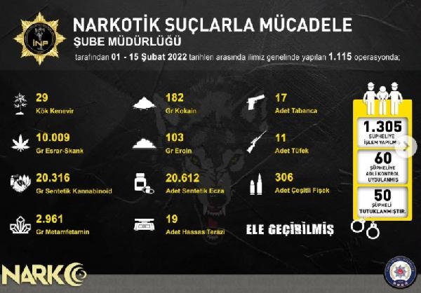 İzmir İl Emniyet Müdürlüğü ekipleri, kentte huzur ve güvenliğin sağlanması, uyuşturucu ve kaçakçılık suçlarının yanı sıra trafik kuralları ihlalini önlemek adına birçok uygulama ve operasyon gerçekleştirdi. Bu kapsamında, Narkotik Suçlarla Mücadele Şube Müdürlüğü ekiplerinin 1-15 Şubat tarihleri arasında gerçekleştirdiği 1150 operasyonda, 29 kök kenevir, yaklaşık 10.009 gram skunk, 20.316 gram sentetik kannabinold, 2.961 gram metamfetamin, 182 gram kokain, 103 gram eroin, 20 bin 613 sentetik ecza hapı, 19 hassas terazi, 17 tabanca, 11 tüfek ve 306 çeşitli fişek ele geçirildiği, 1305 şüpheli hakkında işlem yapıldığı ve adliyeye sevk edilen 110 şüpheliden 60'ının adli kontrol şartı ile serbest bırakıldığı, 50'sinin de tutuklandığı öğrenildi.