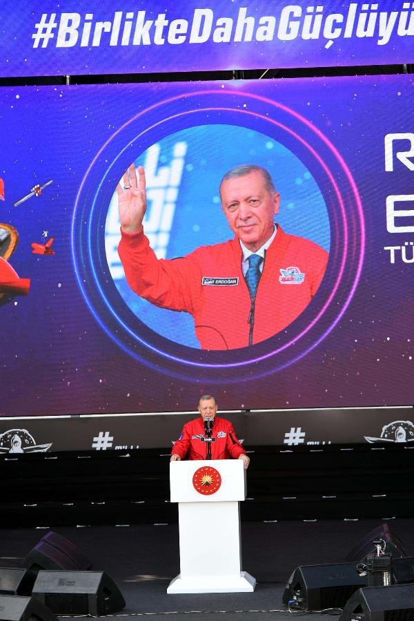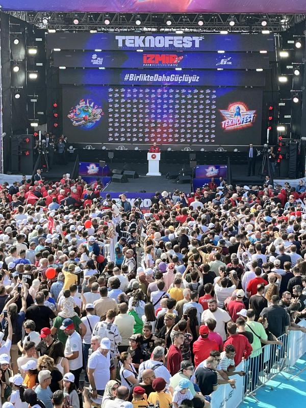 Cumhurbaşkanı Erdoğan, "İzmirli kardeşlerimizi davet ederken; elbette şehrimizin yeni veya eski milletvekillerini de unutmuyoruz. İleri teknolojiyi ülkemiz yerine ta 10 bin kilometre uzaktan arayanları da buraya davet ediyoruz. Bitip tükenmeyen koltuk kavgalarına yalnızca bir günlük 'TEKNOFEST molası' vermeleri kendileri adına büyük kazanç olacaktır. Bugün burada sadece milli teknoloji hamlemizin hepsi gurur kaynağımız olan ürünleri görmüyoruz. Aynı zamanda büyüyen, güçlenen, sınırları aşan, özgüven ve iddia sahibi Türkiye'nin yükselişine de şahit oluyoruz. Çiğli Hava Üssü'nde Kızılelma, Akıncı, ANKA, Hürjet, TB2, TB3, Gökbey, ATAK ile birlikte mücadele var, gayret var, sabır, azim, cesaret var. Burada zorluklar karşısında yıkılmayan, güçlü bir irade var. Burada her türlü engele rağmen başarmaya sevdalı yürekler var. Burada hayallerine giden yolda hiçbir engel tanımayan gençler var. Burada ayağına vurulan asırlık zincirleri parçalayan Türk milleti var. Burada Türkiye Yüzyılı'nın mahsun ve mazlum gönülleri aydınlatan ışığı var. Merhum Abdürrahim Karakoç ne güzel söylemiş, 'İzmir'in sağından, Van'ın solundan, Erzurum, Edirne, Hatay yolundan kapı kapı tekmil Anadolumdan, bir sabah gelecek kardan aydınlık. Evet burada on yıllardır hasretle beklediğimiz kardan aydınlığın muştusu var'" dedi.